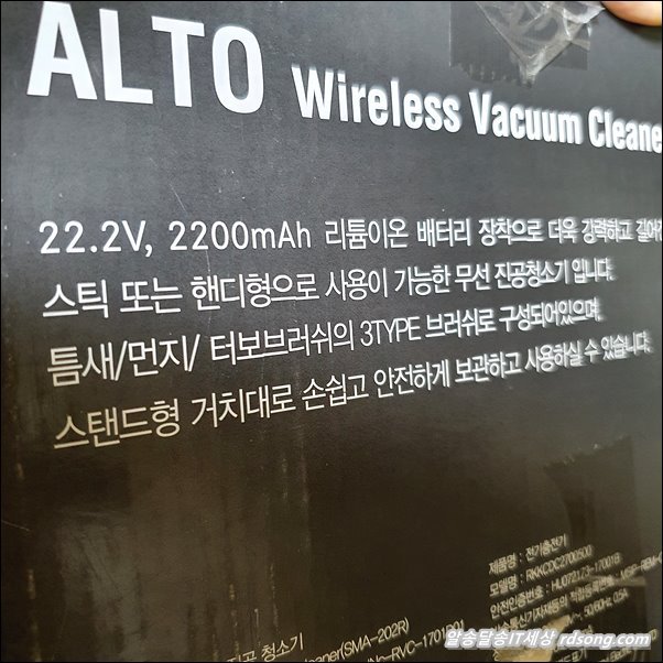 알토 무선청소기 2200mah 리튬이온 배터리 장착되어 있습니다 청소 브러쉬 3개 들어 있고 22.2V 라네요.