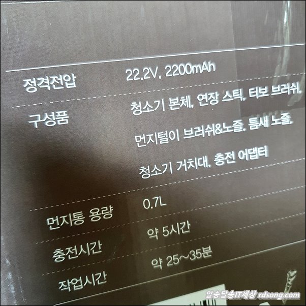 흡입력 120W 싸이클론모터 22.2V 리튬이온 2200 mAh 내장 4-5시간 완충 /