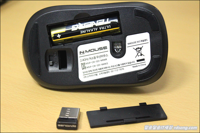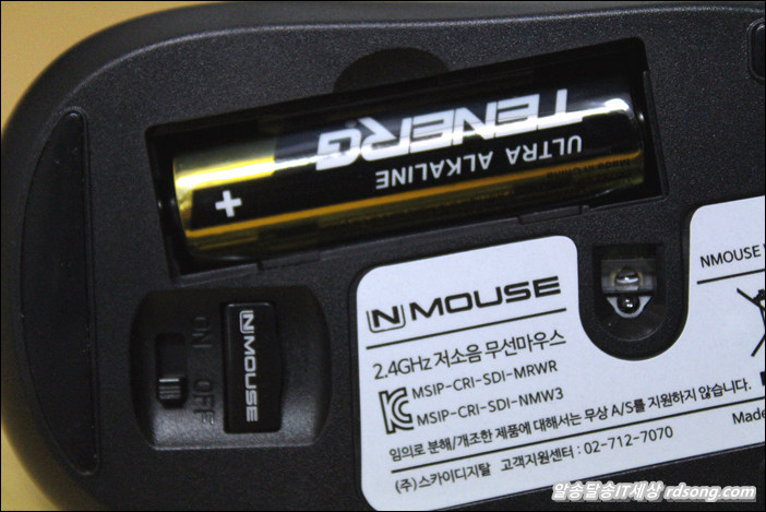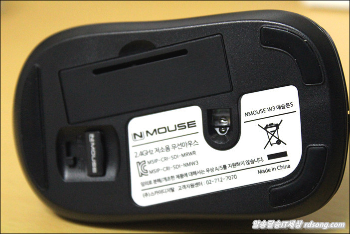 Nmouse w3 애슬론 S 저소음 무선마우스 바닥을 보면 리시버를 부착하도록 되어 있고 on/off 스위치가 있어서 사용하지 않을 때는 off 해야 건전지를 오래 쓸수 있는데요 개인적 경험으로 볼때 가끔은 그냥 끄는 것을 잊어서 벌써 이미 사용중인 무선마우스 건전지를 벌써 교체를 했던 적이 있습니다