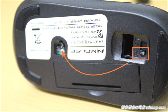 on/off 전원 버튼 내장, 리시버 본체 마우스 바닥에 수납 분실방지, 아마 대부분 이런 스타일이죠