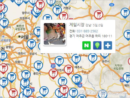 지도에 표시된 아이콘을 누르면 열리는 시골 장날 날짜 및 주소도 나와서 찾아갈수 있죠