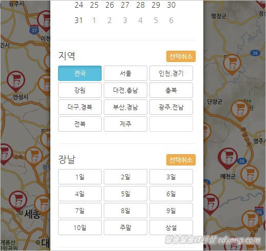 와우맵 지역별로 검색도 가능하고 , 장날, 1일 2일 3일, 4일 5일 6일 7일 8일 9일 10일 주말 상설 별로 검색도 가능합니다