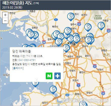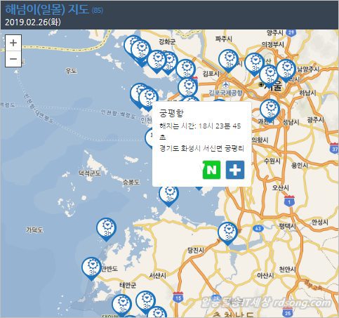 와우맵( wowmap ) 에는 5일장날 외에도 해돋이 일몰 지도 및 관련 지역별 해뜨고 해지는 시간 정보도 나옵니다