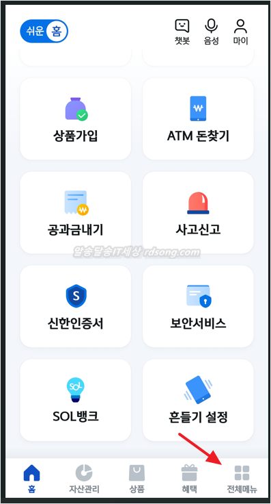 신한 sol 뱅크 앱 깔고 띄워 실시간 입출금 알림 설정 해보도록 하겠습니다. 전체 메뉴 갑니다.