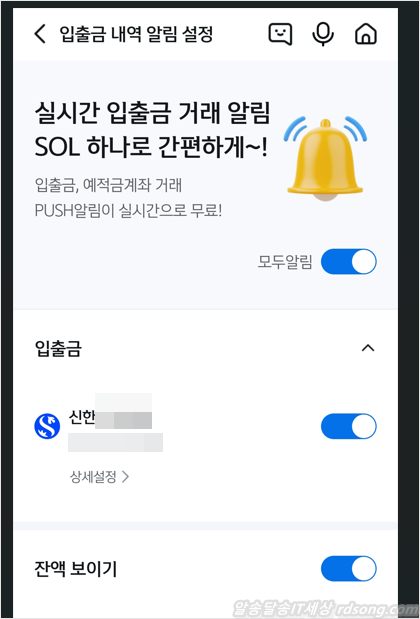 신한 sol 뱅크 앱에 입출금 실시간 설정 방법 마치며 미사용 중이라면 설정해서 사용해 보세요