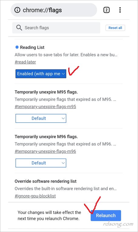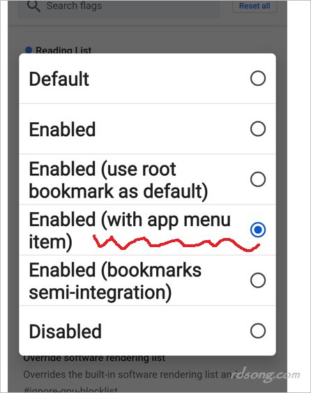 chrome://flags 에서서 reading list 검색하여 해당 옵션 선택 하고 활성 해 줍니다. 그런 다음, 모바일 크롬 재시작 해 줍니다. 그럼 적용이 됩니다.