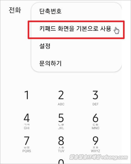 전화앱 설정 > 키패드 화면을 기본으로 사용 터치하여 선택합니다.