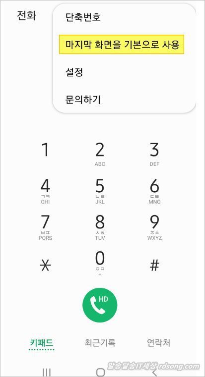 스마트폰 전화 앱 기본으로 설치되 있습니다. 그런대 전화 앱을 터치하여 전화걸려고 하면 다른 화면이 뜨는 경우가 있습니다 왜 그럴까? 그렇게 설정해 놔서 그렇지 뭐..! 마지막 화면을 기본으로 사용하게 설정되어 있어서 그렇습니다