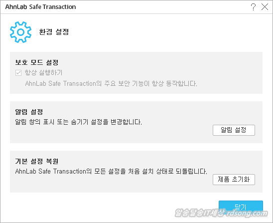 안랩 세이프 트랜잭선 환경설정은 별다르게 건드릴게 없죠 보시다시피 알림설정 옵션 정도 뿐