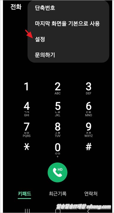 전화 앱 띄우고 설정 으로 터치 합니다.