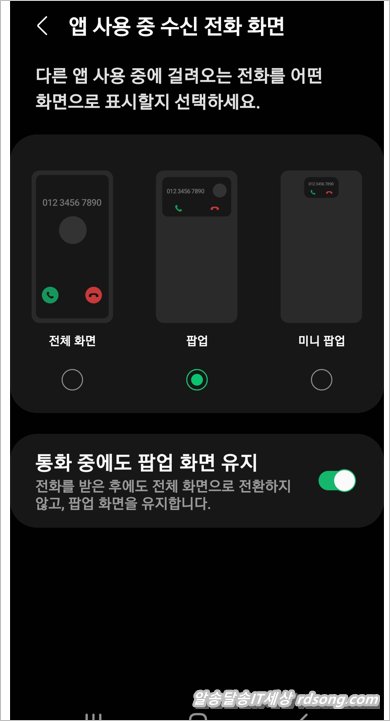 다른 앱 사용중에 걸려오는 전화를 전체화면 , 팝업 화면, 미니팝업 3가지 형태로 선택 할수 있습니다. 통화중에도 팝업 화면 유지 : ON 켜야 합니다. 그렇지 않으면 전화 연결 후 전체 화면으로 전환 되어 화면을 가리게 됩니다. 특히 모바일 내비게이션 사용, 운전 할때 지도화면 가려서 불편 합니다.