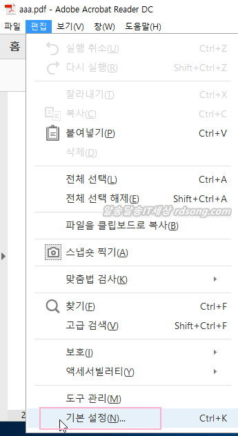 아크로벳 리더의 편집 메뉴에서 기본설정으로 갑니다