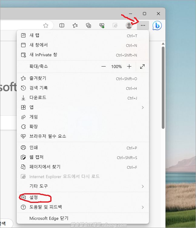 ms 엣지 화면 우측 점3개 누르면 > 설정 나옵니다.