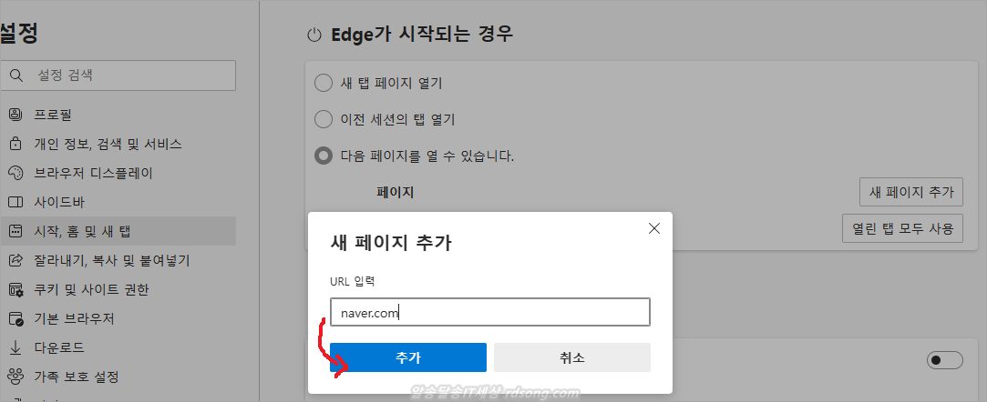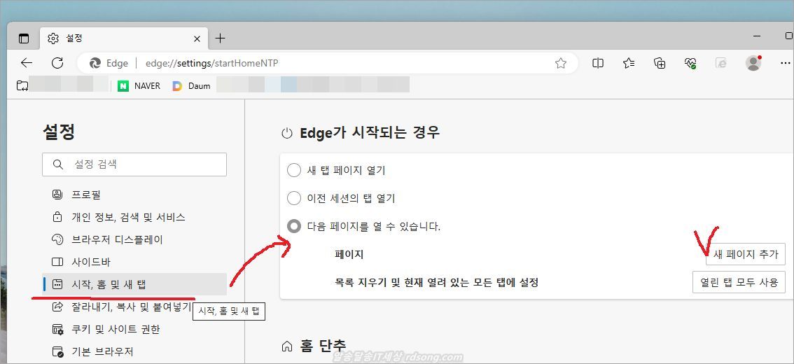 엣지 edge 시작페이지를 네이버 홈페이지 즉 엣지 실행 하면 네이버 홈페이지 항상 열리도록 만드는 방법