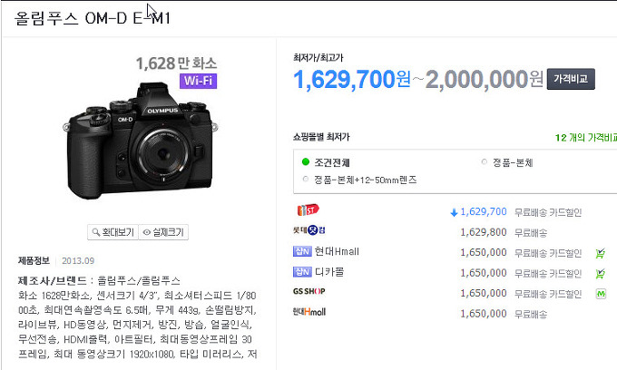 올림푸스 OM-D E-M1 가격이 ! 헉 오픈마켓에 올라온 가격을 보니 160만원 정도 됩니다 너무 비싼거 아녀! 가격은 시간이 지나면 내려갑니다 세월이 해결! 그러나 또다른 최신카메라가 출시