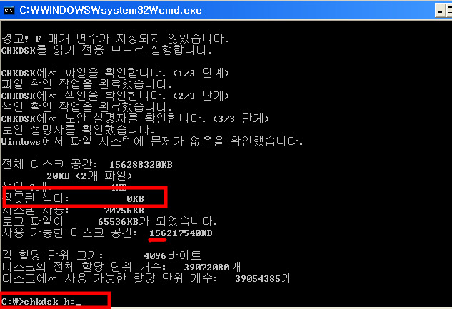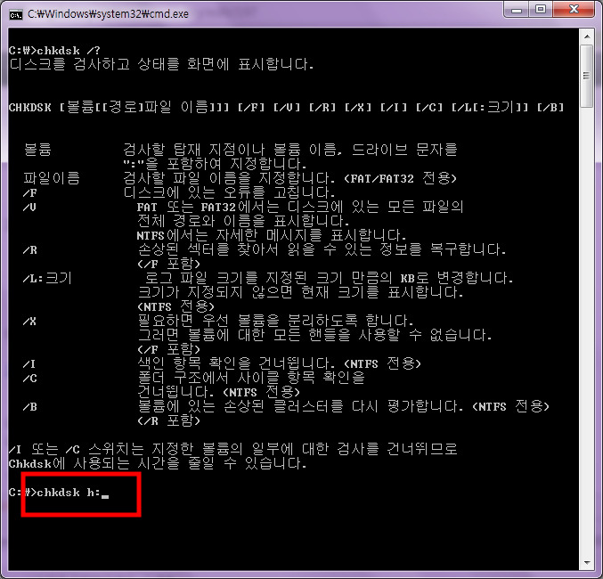 아래 chkdsk 옵션들 중에 /F 는 오류를 수정해 주기도 하는데 이 이옵션을 이용 해 볼 수 있다