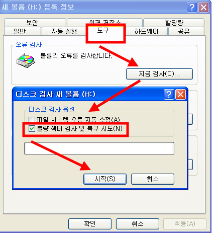 불량섹터 검사 및 복구 시도 와 파일 시스템 오류 자동 수정 ,둘 다 모두 체크 한 후