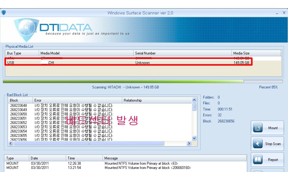 이방법이 속도로 빠르고 외장하드에 베드섹터가 발견되면 베드섹터(bad sector) 부분에 수치로 나타난다