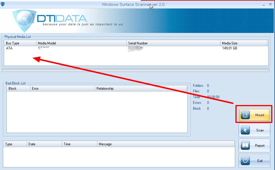 마운트(Mount)를 클릭 하면 외장하드가 USB 라고 나타나며 -> 클릭하여 선택 ->Scan 클릭한다