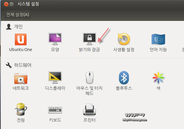 우분투 화면잠금 해제 하려면 우선 상단의 시스템설정에 갑니다 참 우분투 12.10 시스템설정 화면 기준입니다