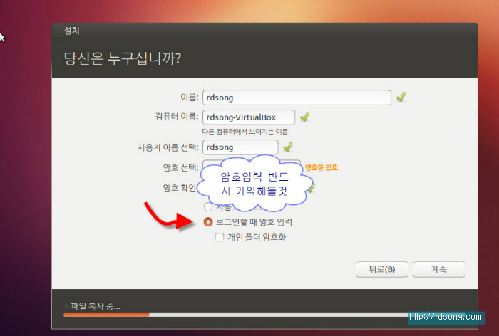 우분투를 처음설치하는 분이라면 12.04LTS버젼을 권하며, 만일 그래픽카드가 정말 빵빵한 수준이라면 최신버젼인 우분투 12.10버젼 설치를 권해 드립니다 또한 우분투 설치도중에 입력한 암호는 꼭 기억을 해둬야 하며 업그레이드나 패키지설치 등 기타 설정시 반드시 필요하기 때문이죠