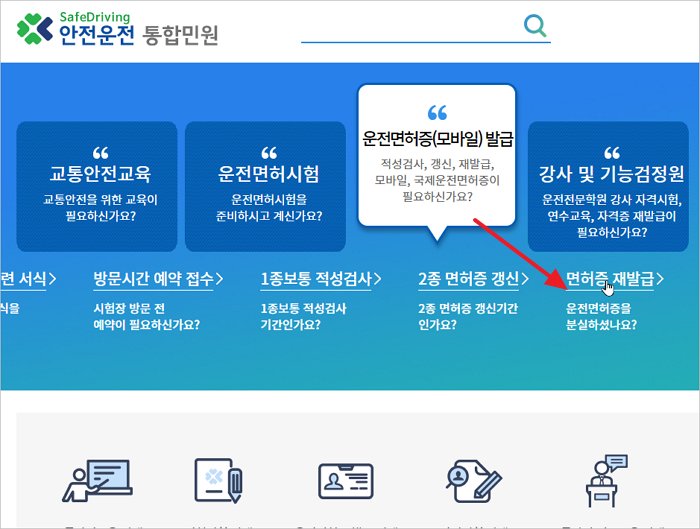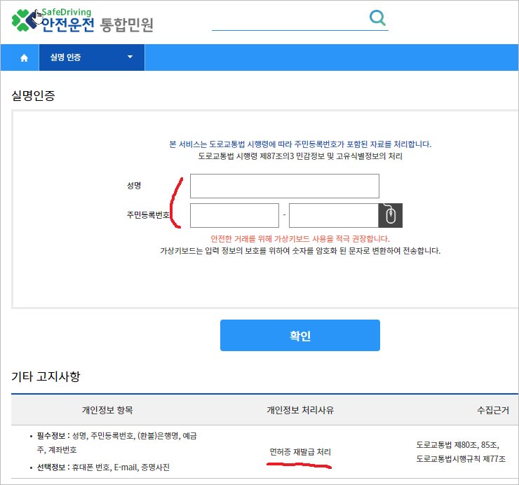 안전운전 통합민원 사이트 이용시 실명인증 처리 해야 접수가 됩니다. 확인 하고 단계적으로 처리하면 재발급 받으시면 됩니다.