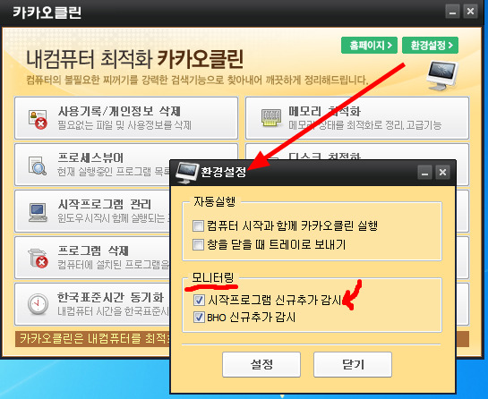 환경설정에서 자동 실행옵션이 있는데 구지 매번 윈도우 부팅할 때마다 카카오클린을 실행할 필요는 없을거 같고 그냥 가끔 한번 씩 실행해서 돌려 주면 되지 않을까 싶습니다