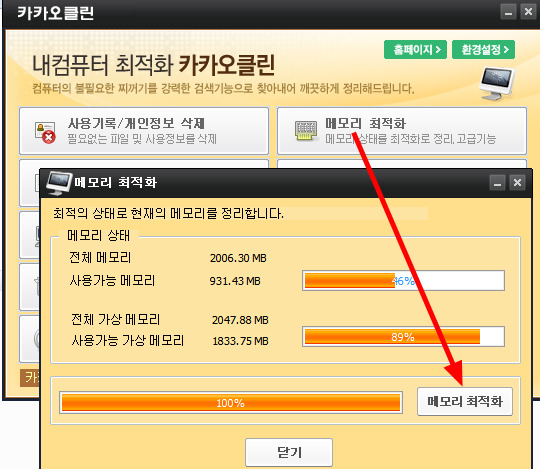 컴퓨터 메모리 최적화는 메모리에 쓸데없이 올라와 있는 것들을 날려 버리고 다시 반환하는 것이므로 그냥 한번