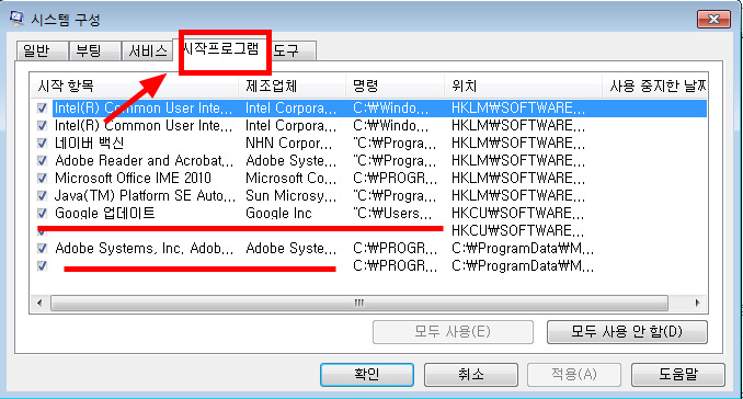 가끔 시작프로그램들어가서 불필요하게 시작되는 것들을 과감히 지워 버려도 됩니다 시작프로그램에 올라가는 것들은 대부분 프로그램 실시간 업데이트를 위한 프로그램이 올라와 있습니다