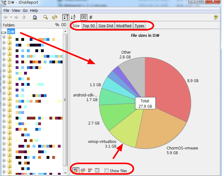 또다른 jdiskReport 란 프로그램도 역시 이미지도 보여주고, 아래 옵션을 선택하면  파일크기도 보여주어 그냥 한 눈에 파악