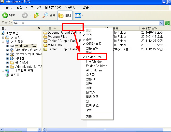 윈도우 xp 폴더크기(folder size) 보이게 하는 방법