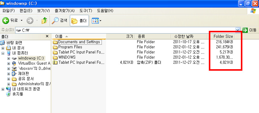 윈도우xp는 내컴퓨터나 윈도우 탐색기 폴더크기 사이즈를 알려면 오픈소스로 나와있는 프로그램을 다운받아 설치를 해야 합니다