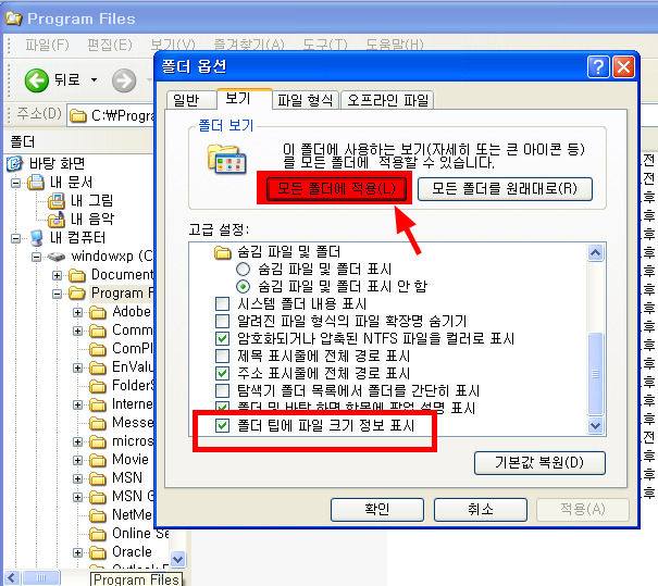 아래처럼 폴더옵션에서 반드시 모든 폴더에 적용를 눌러 줘야 모든 폴더에 크기 나타나게 됩니다