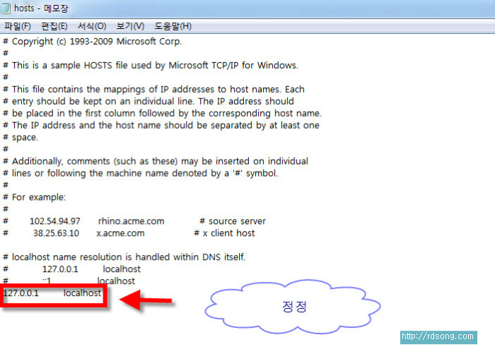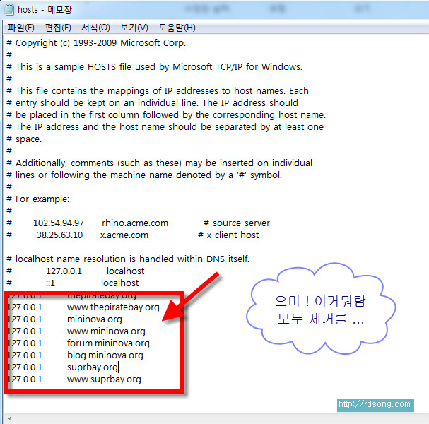 컴퓨터의 hosts 파일은 상당히 중요한 포지션 파일로 꼭 확인해서 깨끗한지 가끔 열어 보시는것이 좋습니다