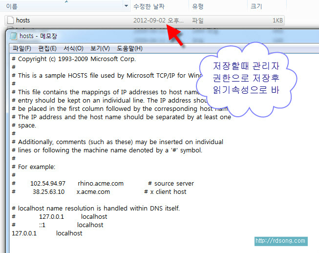 hosts 파일을 저장할 때는 관리자 권한을 가진 사용자가 저장할수 있고 , hosts파일이 읽기 전용으로 되어 있기 때문에 읽기전용을 해제후 저장하고 ,다시 원래대로 읽기전용 옵션을 체크해 주면 됩니다