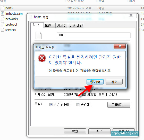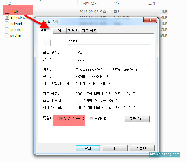읽기전용으로 hosts 파일을 체크하고 적용을 해줍니다