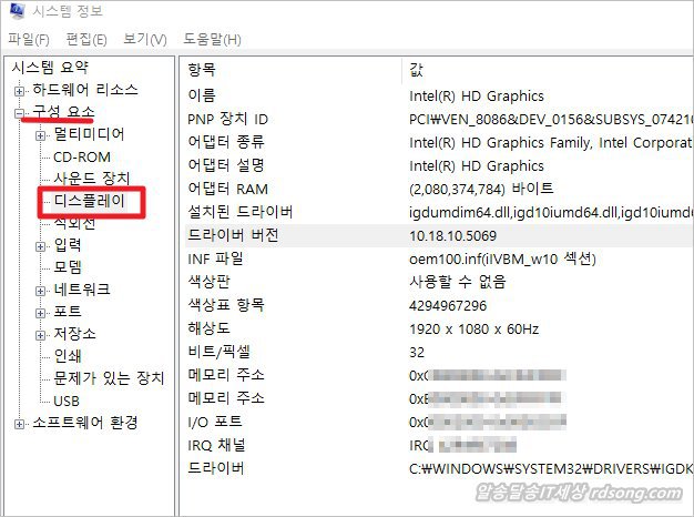 하드웨어 리소 뿐만 아니라 소프트웨어 환경 정보 및 구성요소 > 디스플레이 보면 컴퓨터 설치된 그래픽 카드 정보 이름, 드라이버 버전 등을 알수 있습니다.