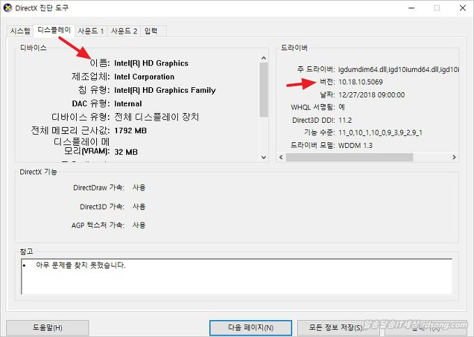 directx 진단도구 실행 하는 명령어 로써, 시스템 뿐만 아니라 디스플레이 이름 , 그래픽 카드 이름 및 드라이버 버전을 알수 있습니다