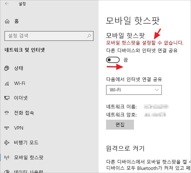 아래처럼 모바일 핫스팟 설정 할수 없습니다 라고 스위치를 켜려고 해도 켜지지가 않습니다