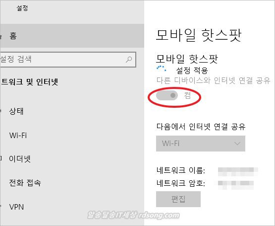 그런데 원할하게 작동이 되질 않네요 내 노트북만의 문제 인듯 싶네요 다른 윈도우10 1803 노트북에서 모바일 핫스팟 정상적으로 작동이 되는 것으로 봐서 말이죠