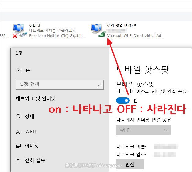 모바일 핫스팟 off 하면 가상 어댑터가 사라집니다