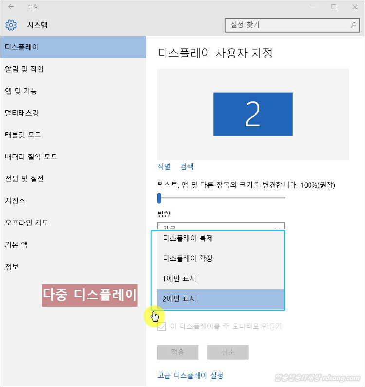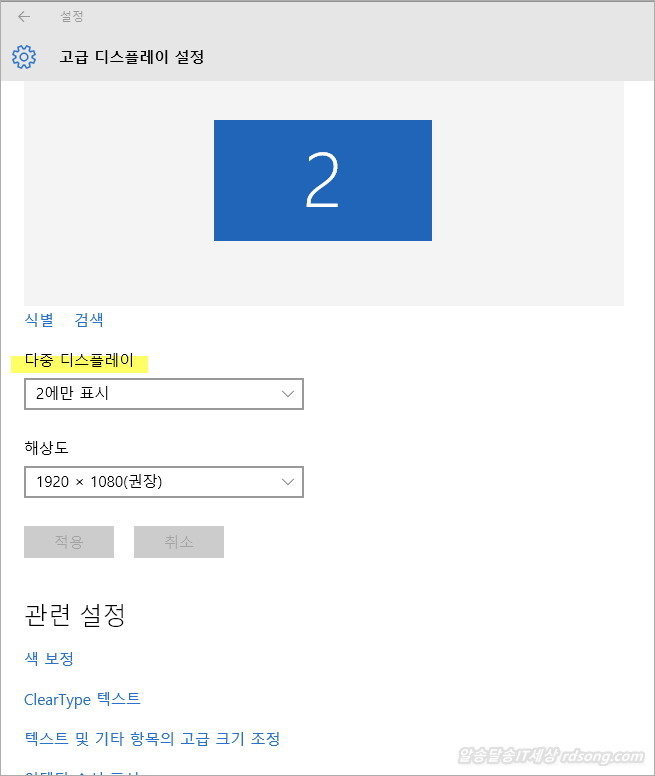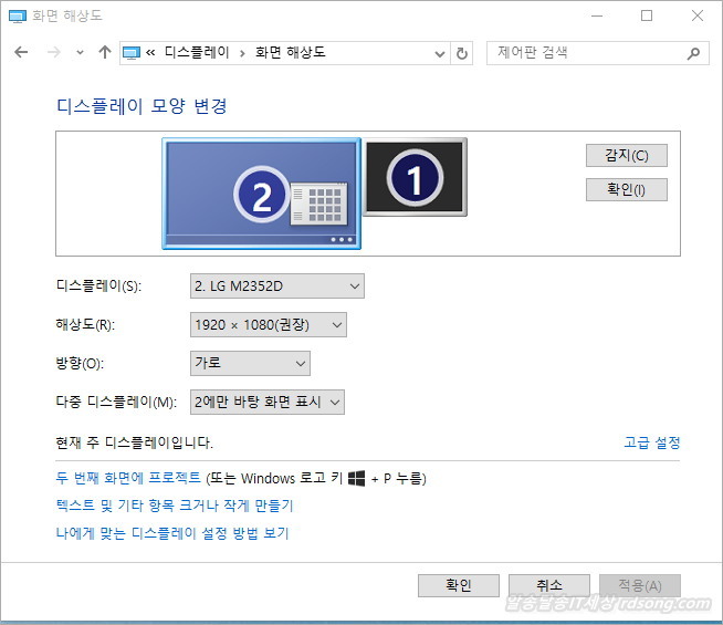 다중 디스플레이 설정 : 2에만 설정은 보조모니터만 화면이 나타남 ▲