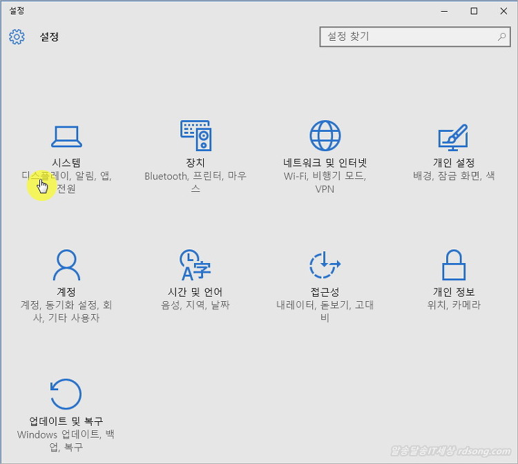 윈도우10의 설정 메뉴 (바탕 우측 하단)를 이용하든 제어판을 이용하든지 관련 메뉴에 진입하는 것은 알아서 찾아가면 되지만
