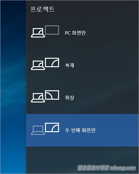 PC화면만, 복제, 확장,두번째 화면만 4가지의 형태로 다중모니터연결을 제어할수 있습니다