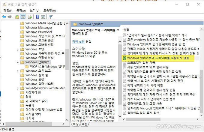 컴퓨터 구성 – 관리 템플릿- windows 구성요소-windows 업데이트 – windows 업데이트에 대한 드라이버를 포함하지 않음- 사용