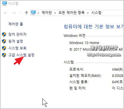 시스템의 고급 시스템 설정으로 갑니다 여기서 장치 설치 설정을 컨트롤 합니다