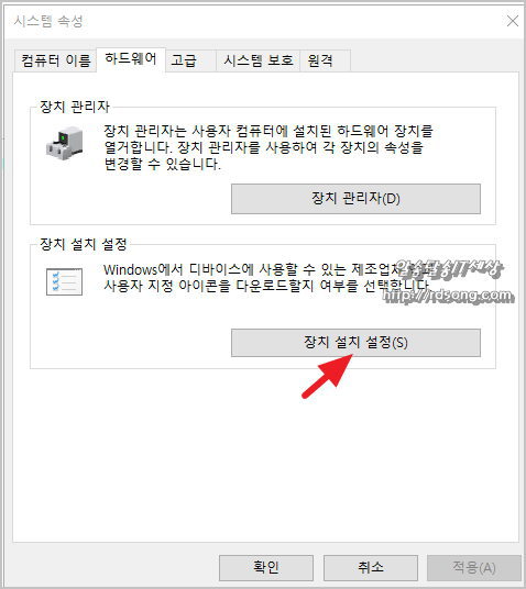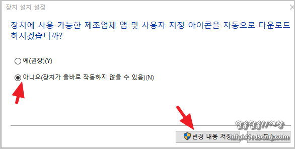 하드웨어 에서 장치 설치 설정 을 눌러 봅니다