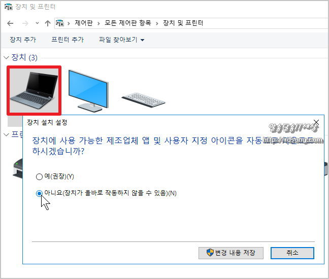 기본적으로 예가 선택이 되어 있으며 아니요로 선택해 줍니다