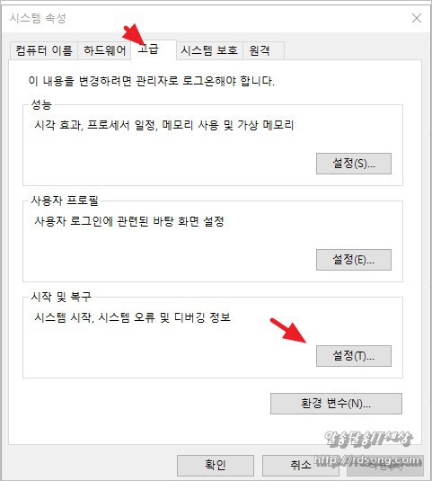 고급 탭에서 아래의 시작 및 복구( 시스템 시작 시스템오류 및 디버깅 정보) 내용의 설정에 갑니다