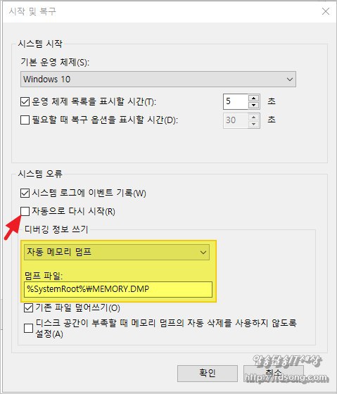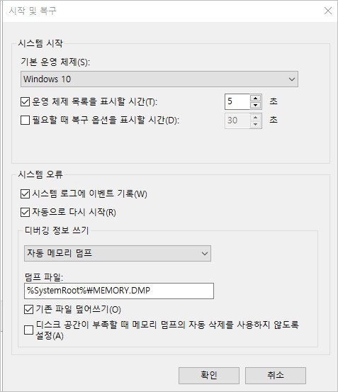 이렇게 설정을 해 놓으면 나중에 윈도우10 또는 윈도우7 사용중에 갑작스런 블루 스크린이 뜨면 윈도우가 해당위치에 메모리 덤프파일을 생성을 해 줍니다